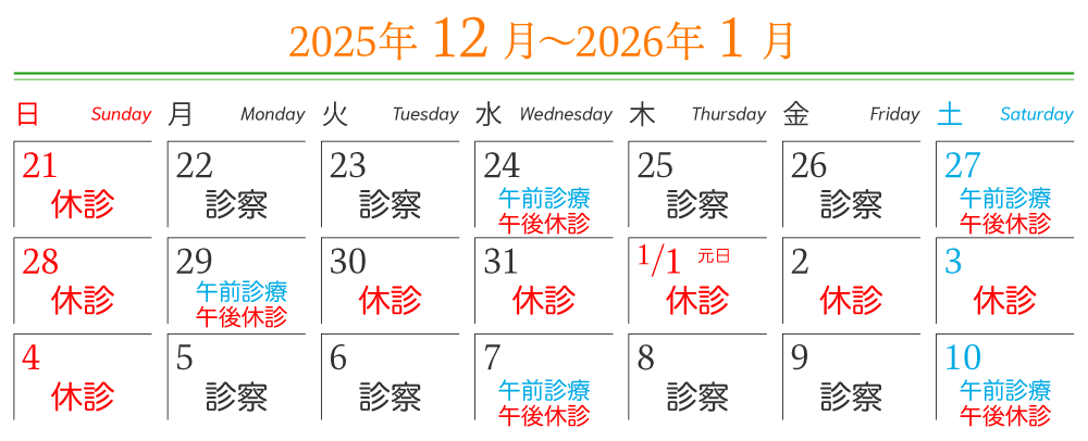 2025年12月29日(月)午後から2026年1月4日(日)まで年末年始の休診とさせていただきます。